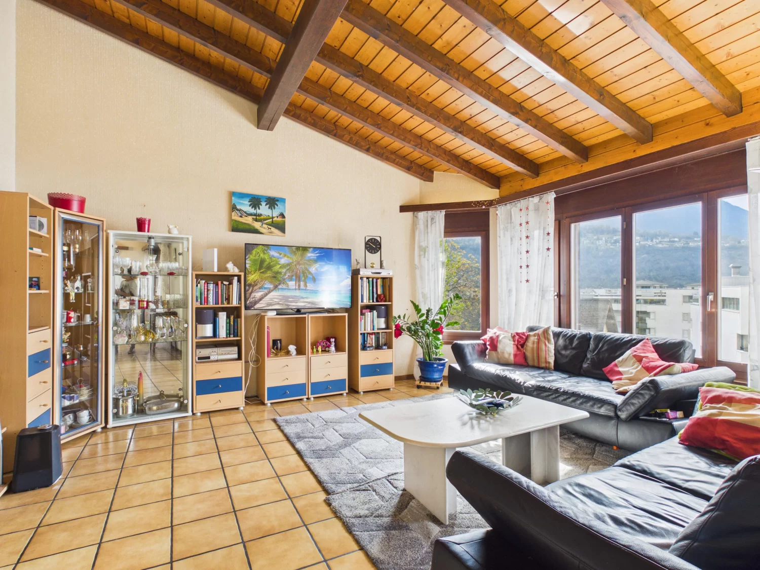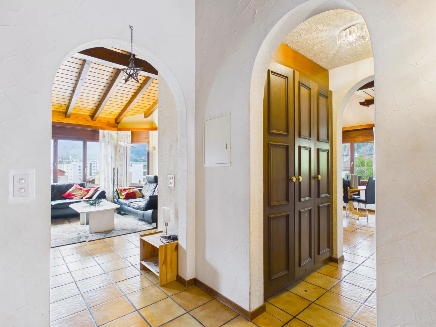 Schon beim Eintreten empfängt Sie ein einladender Eingangsbereich mit praktischen Einbauschränken und vermittelt sofort ein Gefühl von Ankommen. Das Herzstück der Wohnung bildet das lichtdurchflutete Wohnzimmer mit seiner beeindruckenden offenen Dachkonstruktion. Die grosszügige Raumhöhe und das Spiel von Licht und Raum schaffen eine Atmosphäre, die gleichzeitig luftig und behaglich ist.