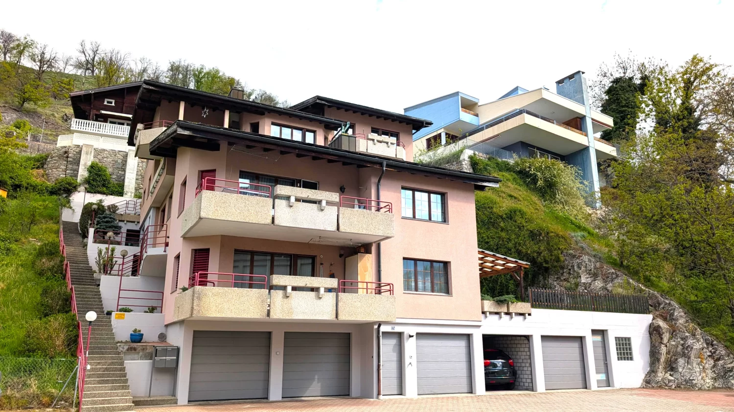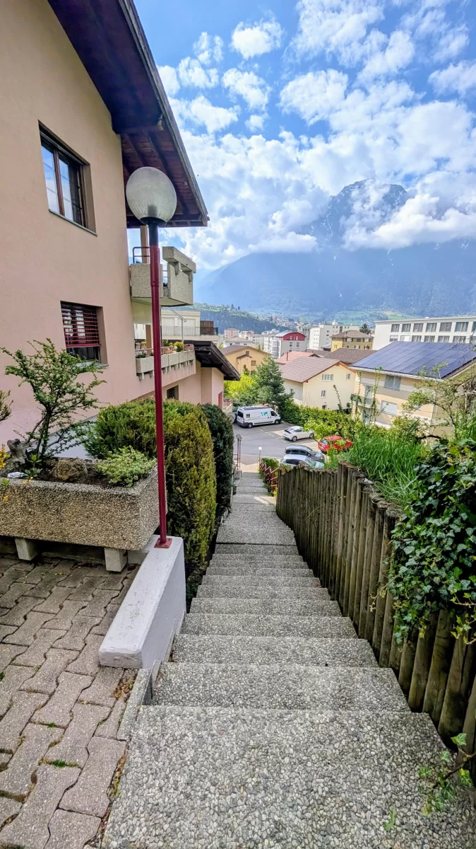 Der Zugang zur Wohnung erfolgt über eine Aussentreppe mit rund 100 Stufen, die über eine sehr angenehme Treppenstufenhöhe verfügen; ein Personenlift ist nicht vorhanden.