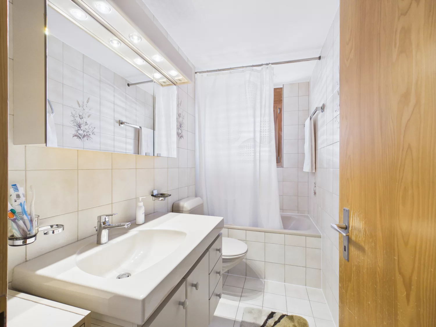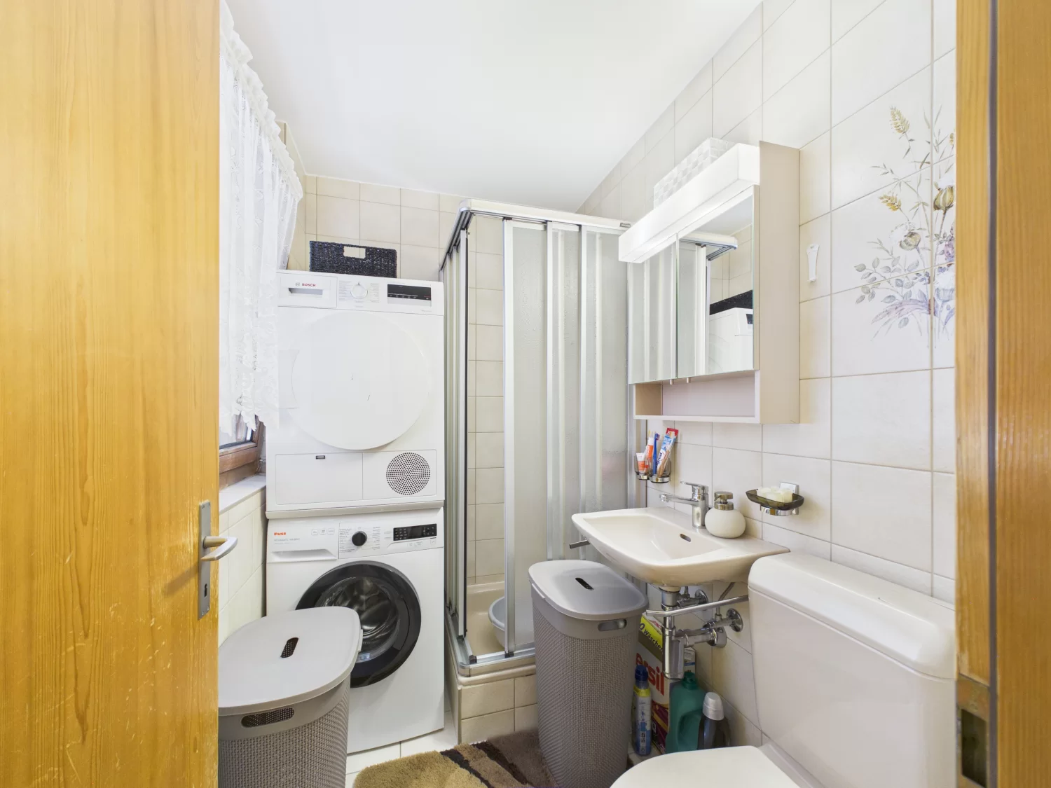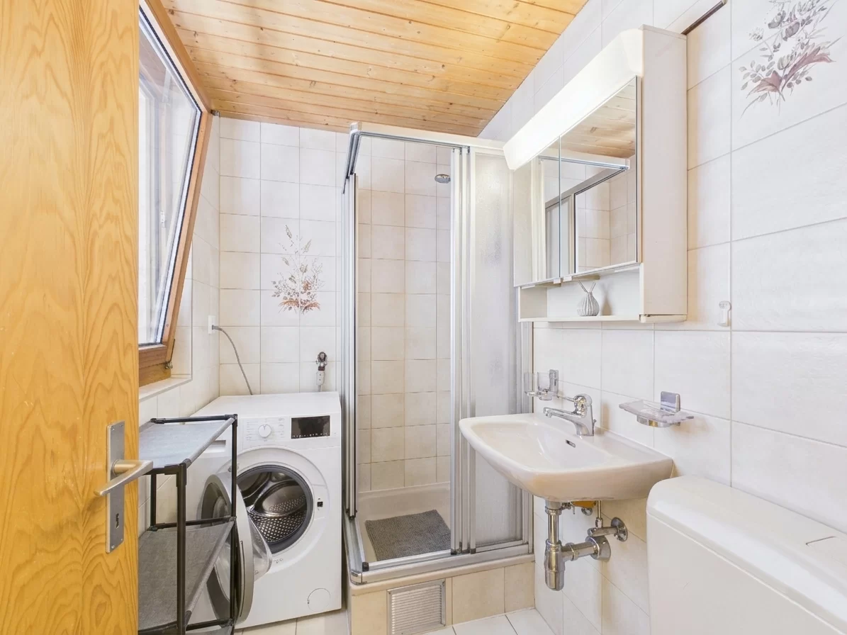 - Badezimmer mit WC, Dusche, Lavabo und Waschmaschinenanschluss