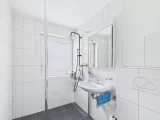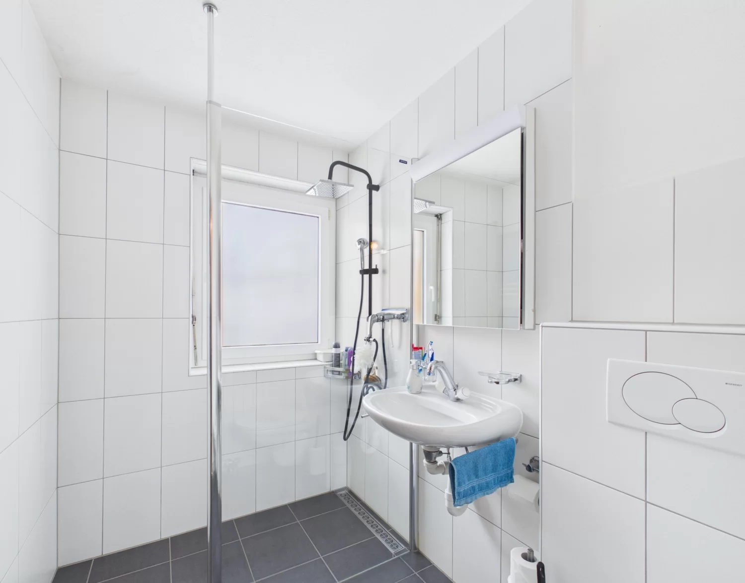 Das moderne Badezimmer ist mit WC, Dusche und Lavabo ausgestattet.