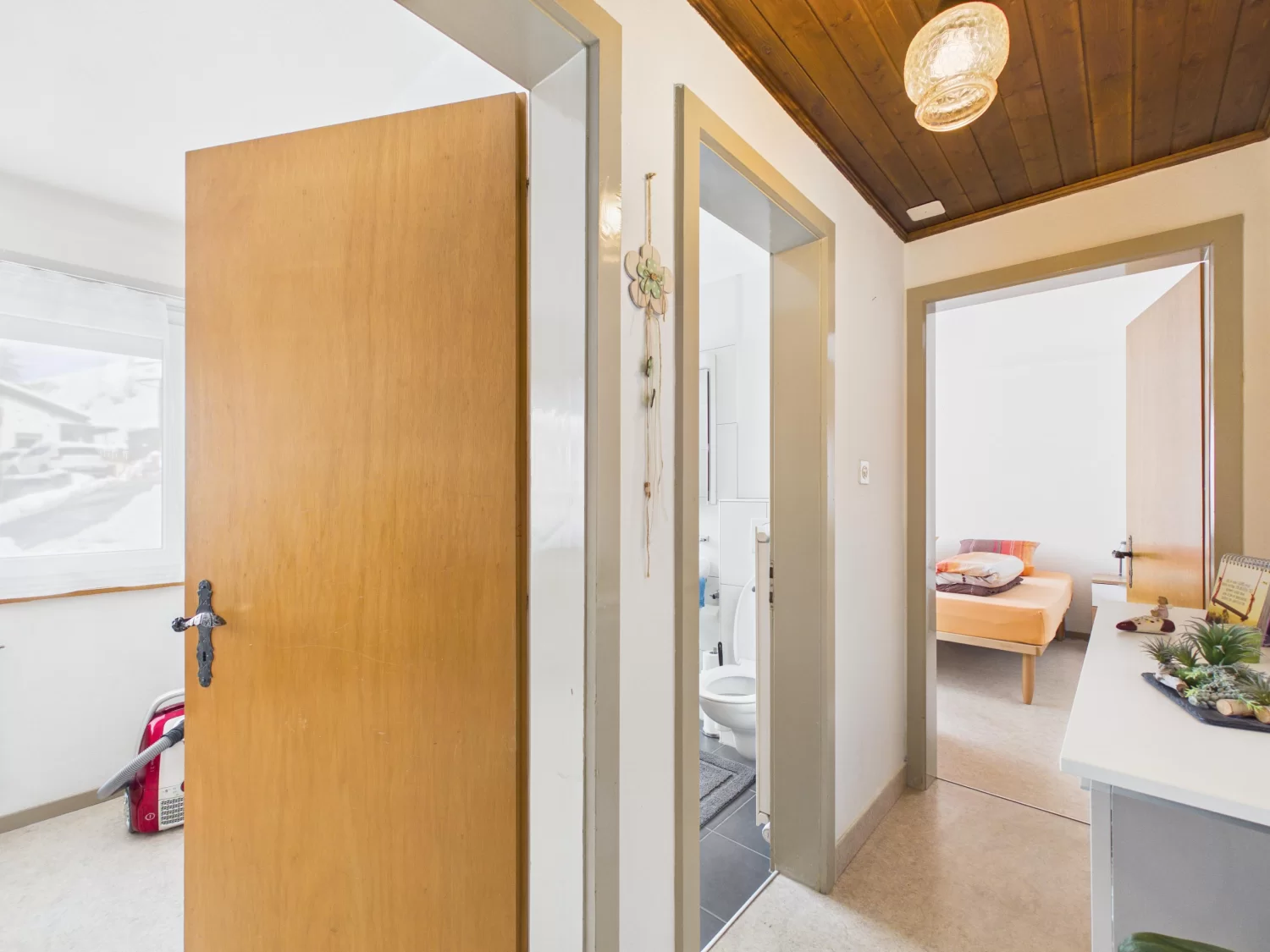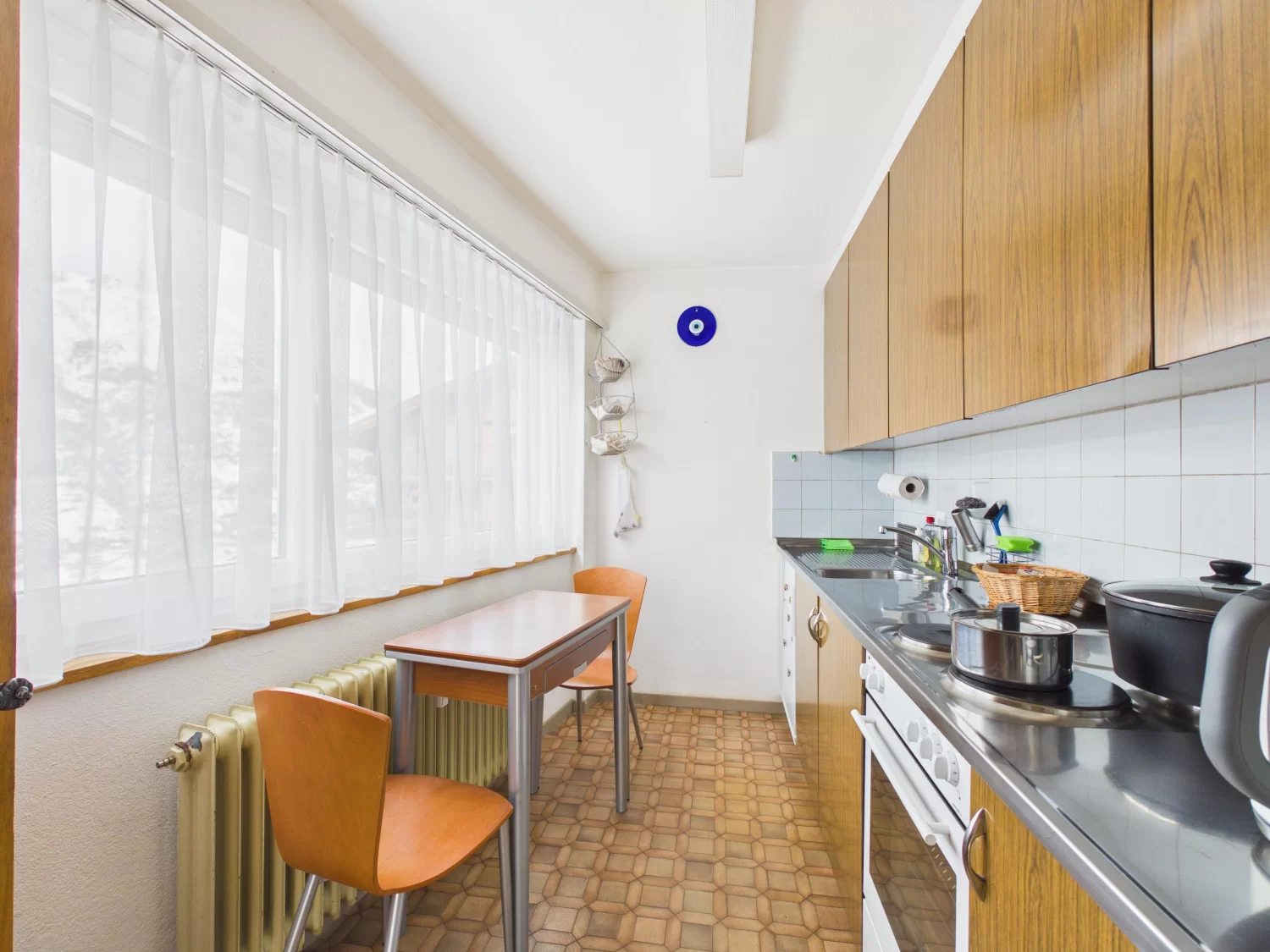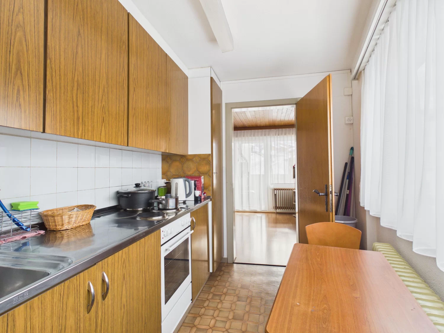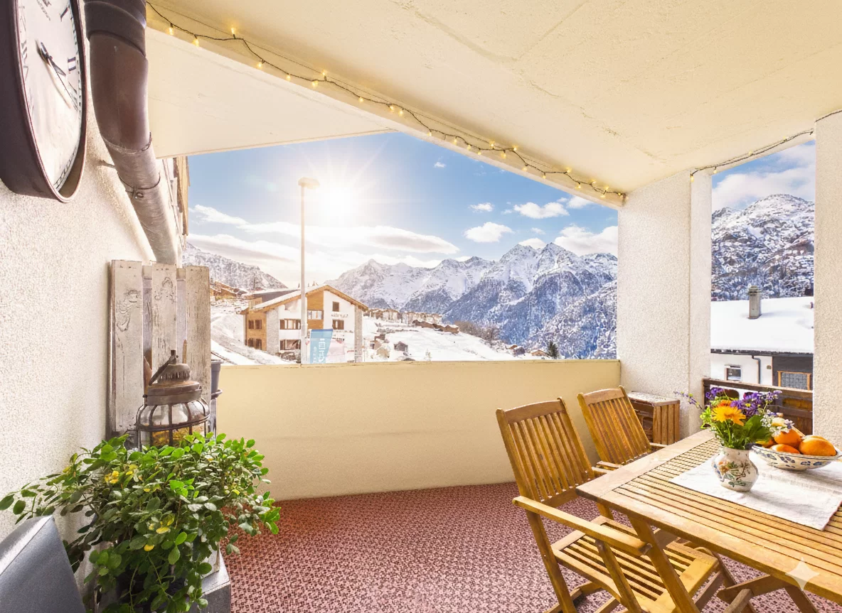 Zwei Schlafzimmer, eine Küche mit Renovationspotenzial sowie ein helles Wohnzimmer mit direktem Zugang zum grosszügigen Balkon runden das Raumangebot ab. Von hier geniessen Sie einen sensationellen Ausblick auf die beeindruckenden Walliser Alpen.
