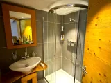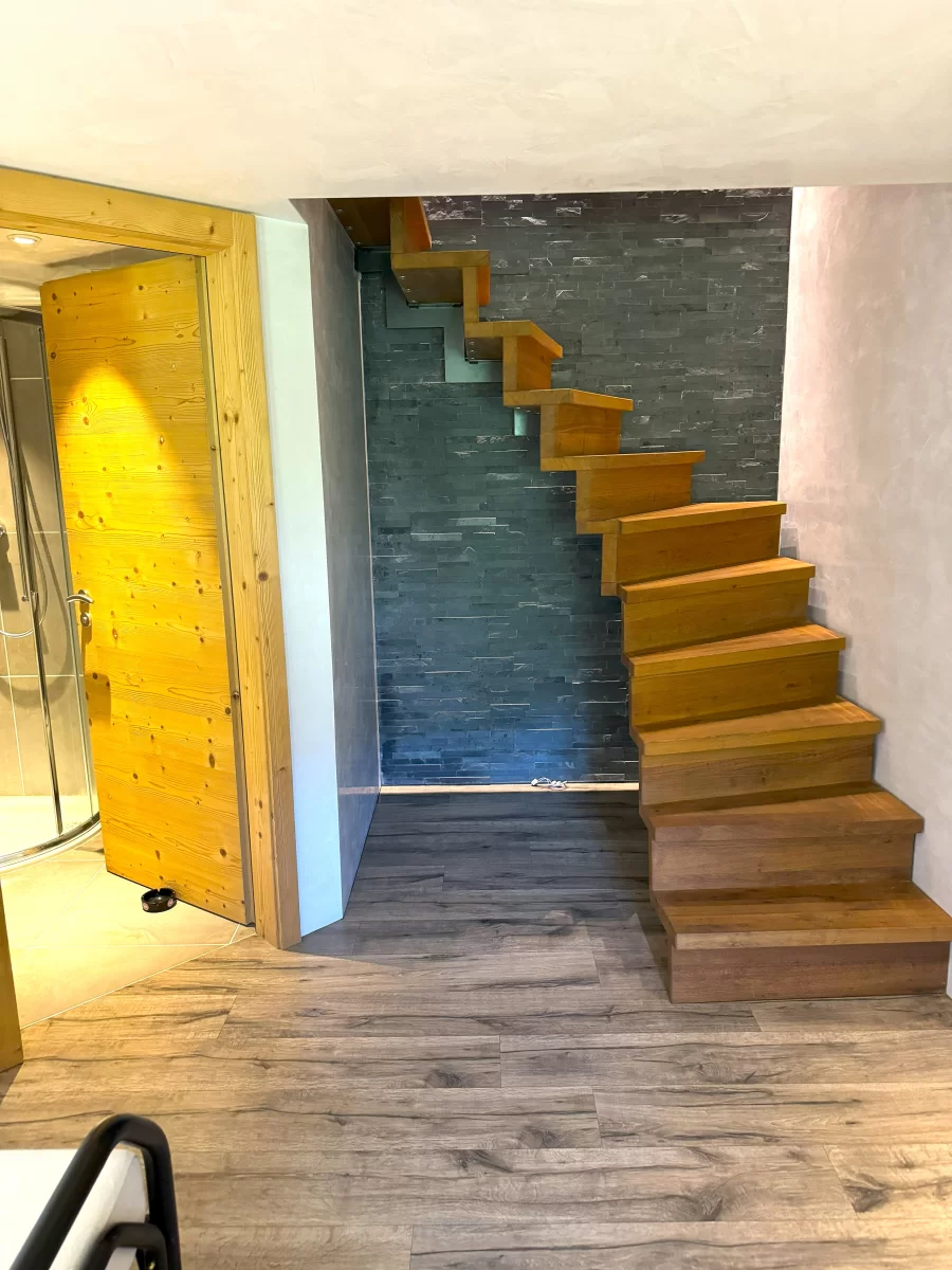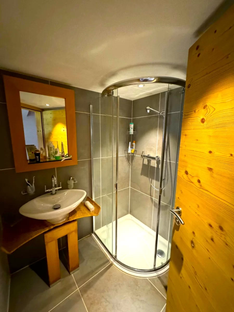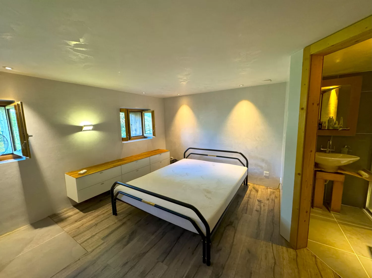 Im Untergeschoss befindet sich ein grosszügiges Schlafzimmer mit Holzofen, der auch an kühlen Tagen behagliche Wärme spendet. Ergänzt wird diese Ebene durch ein Badezimmer mit Dusche, WC und Lavabo.