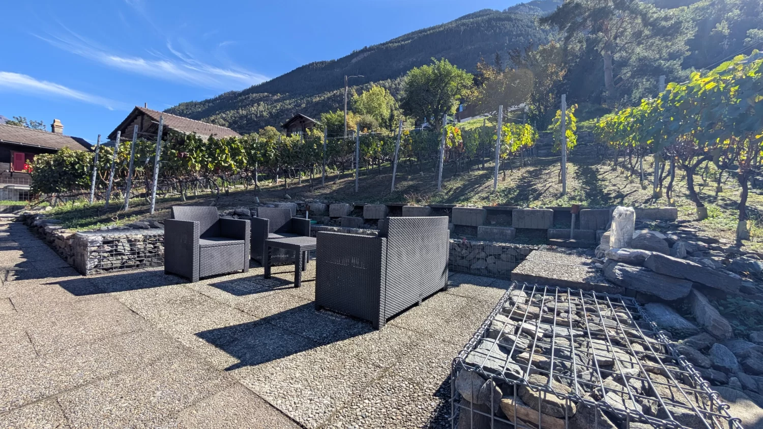 Die Rebenstöcke, die das ländliche Ambiente perfekt abrunden, stehen direkt vor dem Haus. Der einladende Sitzplatz zwischen den Reben ist ein Ort der Ruhe – ideal, um die Natur zu erleben, ein Glas Walliser Wein zu geniessen und einfach den Moment zu leben.