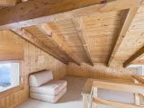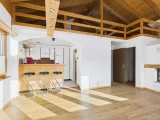Im Obergeschoss befinden sich Küche, Wohn- und Essbereich, ein helles Schlafzimmer sowie ein Badezimmer. Der gemütliche Wohnraum mit Cheminée sorgt im Winter für behagliche Stunden, während der Balkon und der gedeckte Sitzplatz sonnige Tage im Freien ermöglichen. Über eine Holzleiter gelangt man zur offenen Galerie – perfekt als zusätzlicher Ruhe- oder Arbeitsbereich.
