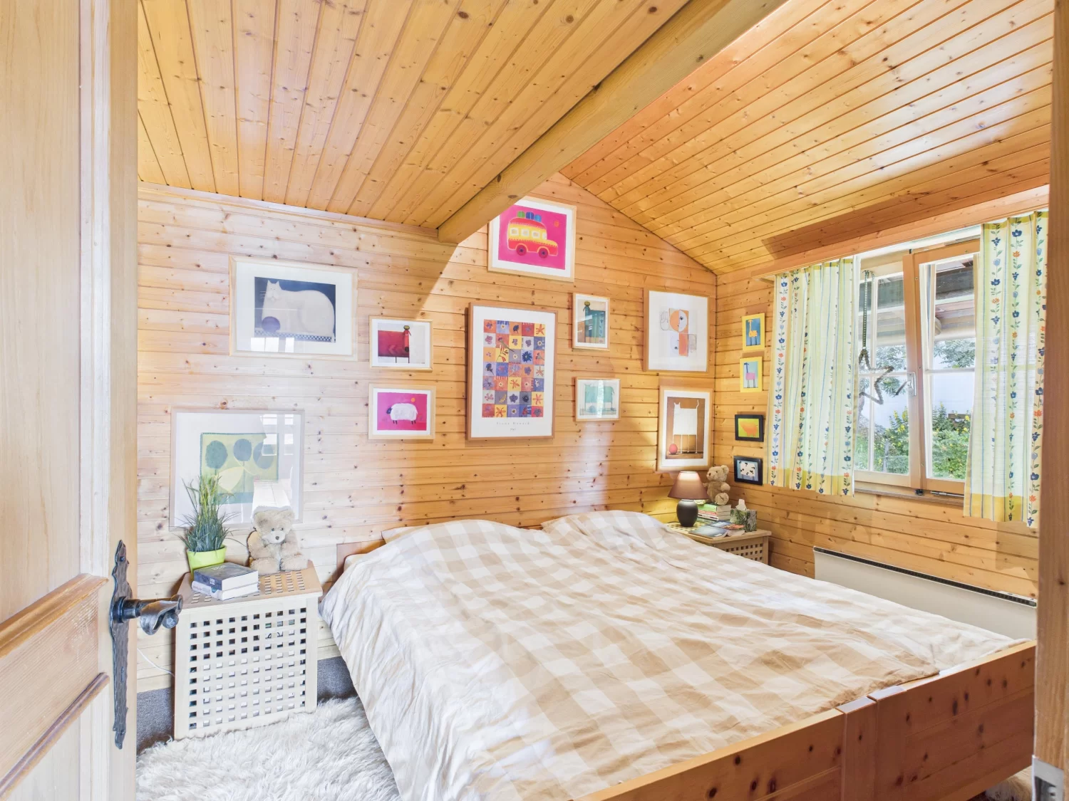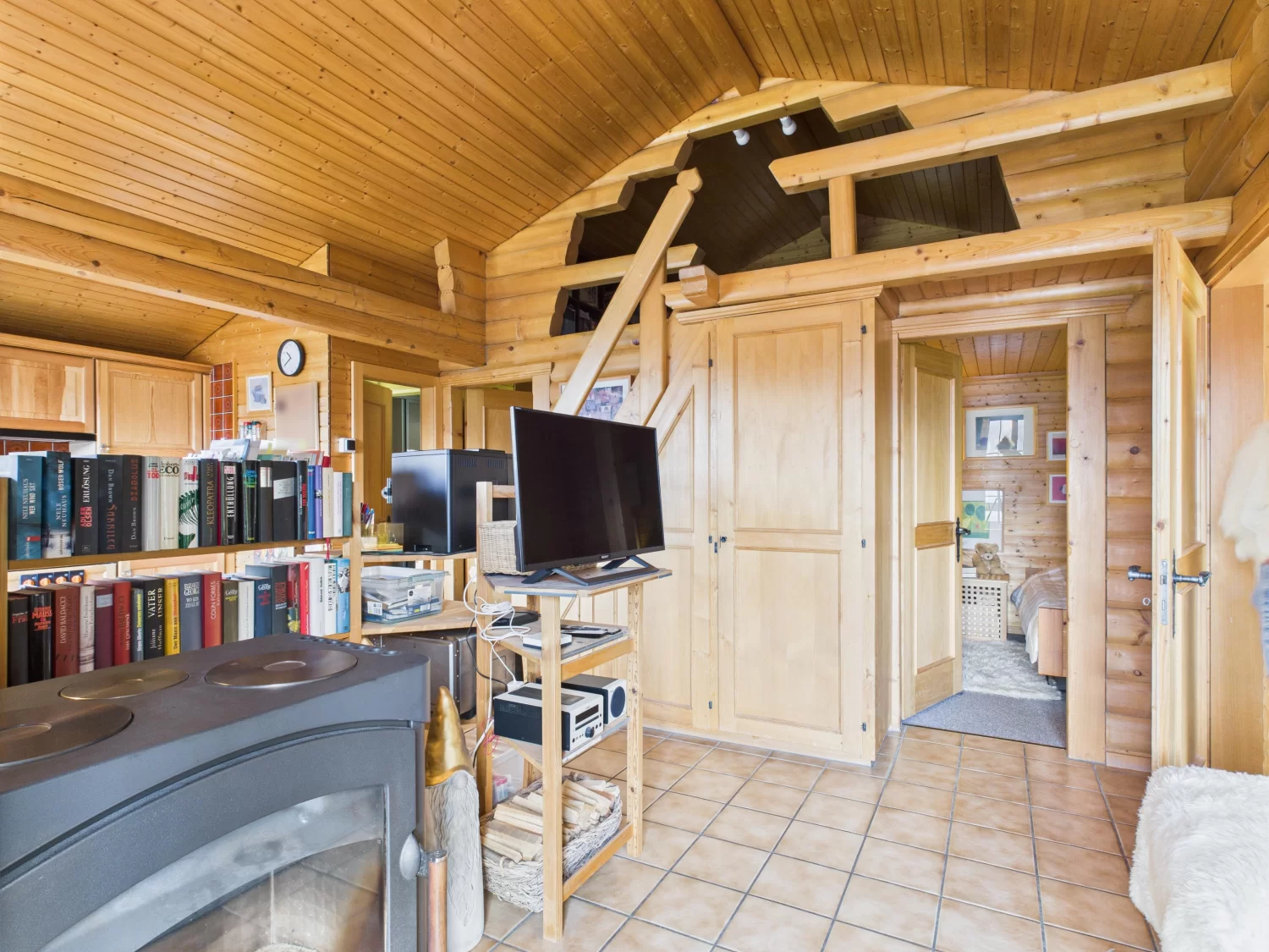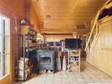 Über eine Aussentreppe gelangt man in das Obergeschoss, das einen praktischen Eingangsbereich mit Garderobe beherbergt. Hier öffnet sich ein grosszügiges Wohnzimmer, das durch grosse Fenster viel Tageslicht empfängt und mit einem Kaminofen für Wohlbehagen sorgt. Der Raum geht fliessend in einen offenen Küchen-, Ess- und Wohnbereich über. Zudem gibt es ein gemütliches Elternschlafzimmer, ein Kinderzimmer und ein modernes Badezimmer, das mit Dusche, WC und Lavabo ausgestattet ist. Eine Galerie bietet zusätzlichen Platz für kreative Ideen und Nutzungsmöglichkeiten.