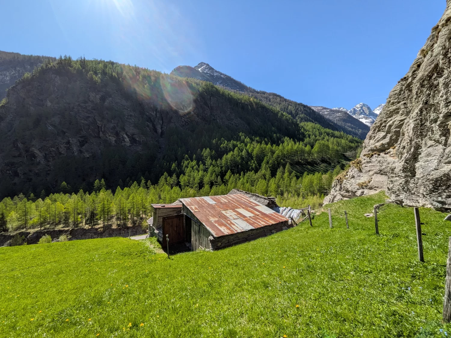 Die Parzelle umfasst 995 m2 und ist von einer Wiese umgeben, die von einem ortsansässigen Bauern bewirtschaftet wird. Hinter dem Gebäude besteht zudem die Möglichkeit, einen gemütlichen Vorplatz einzurichten – ein idealer Ort, um die Bergluft und die eindrucksvolle Kulisse zu geniessen.