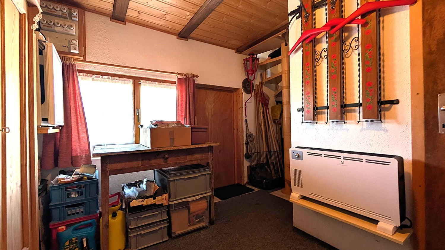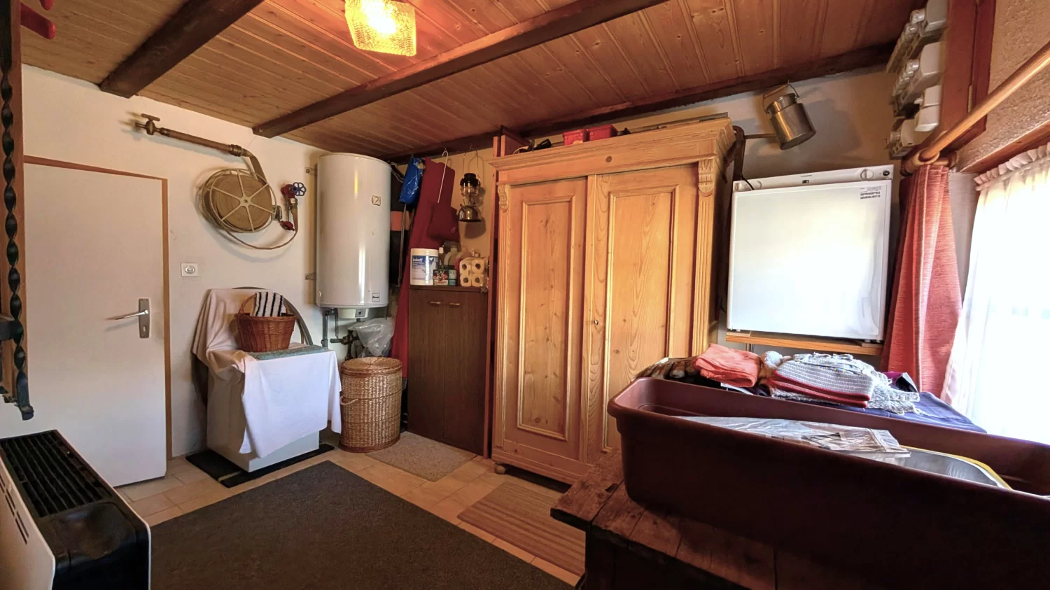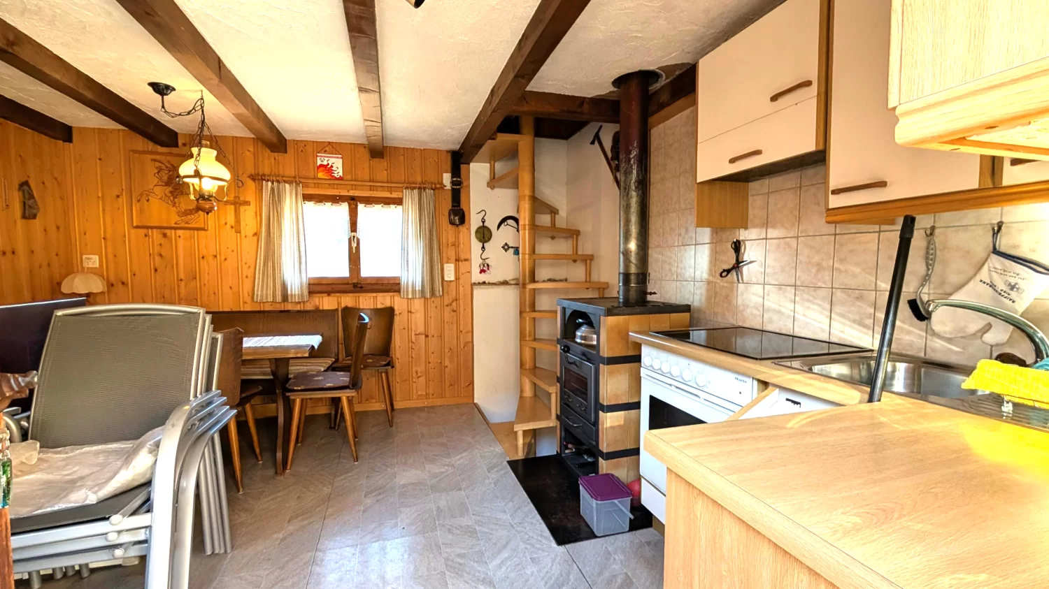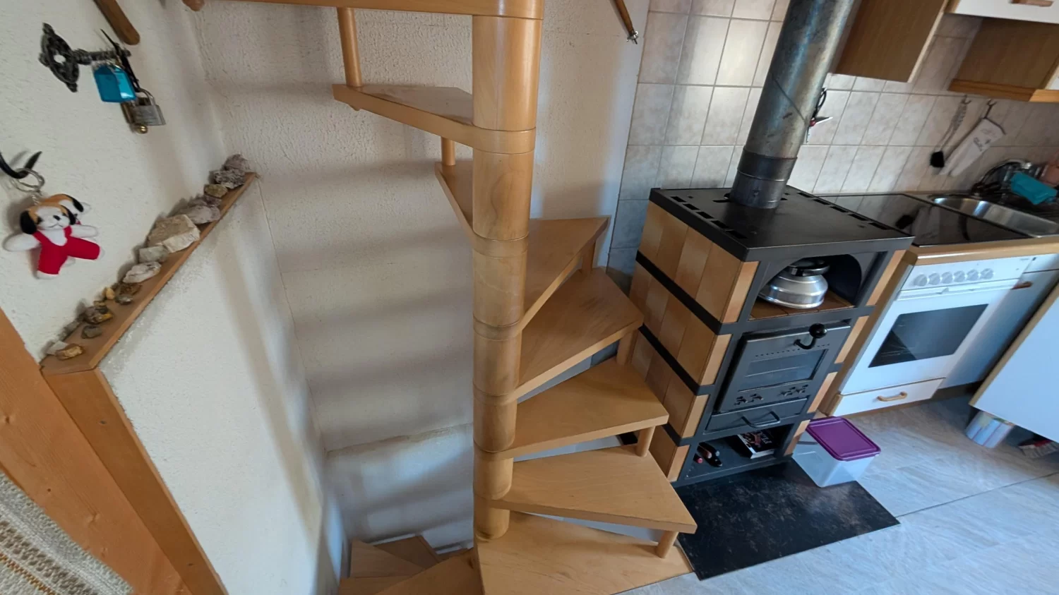 Im Erdgeschoss befinden sich ein kühler Naturkeller zur Vorratshaltung, eine praktische Waschküche mit Abstellfläche sowie ein Badezimmer mit Dusche und WC, beheizt durch einen kleinen Elektroofen. Eine Wendeltreppe führt in die Wohnküche, die mit einem Schwedenofen eine behagliche Atmosphäre schafft. Von hier aus erfolgt auch der Hauszugang. Direkt davor liegt der gemütliche Aussensitzplatz mit Steingrill – ein idealer Ort für gesellige Stunden im Freien.