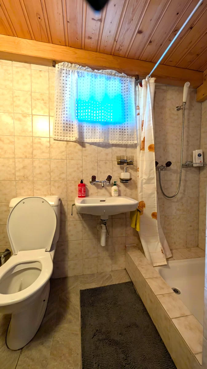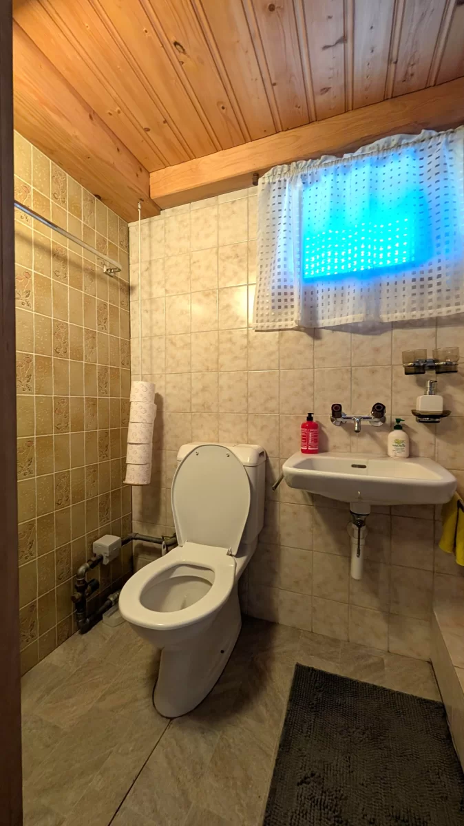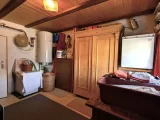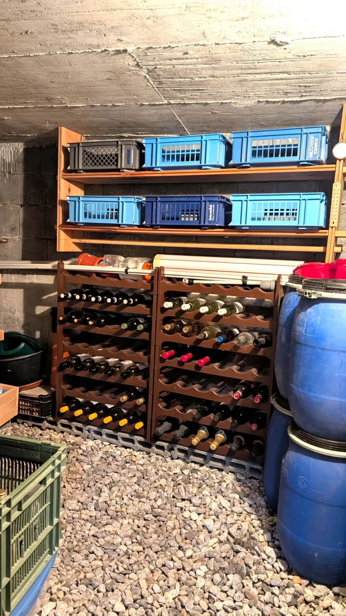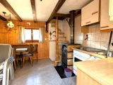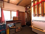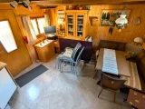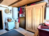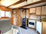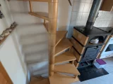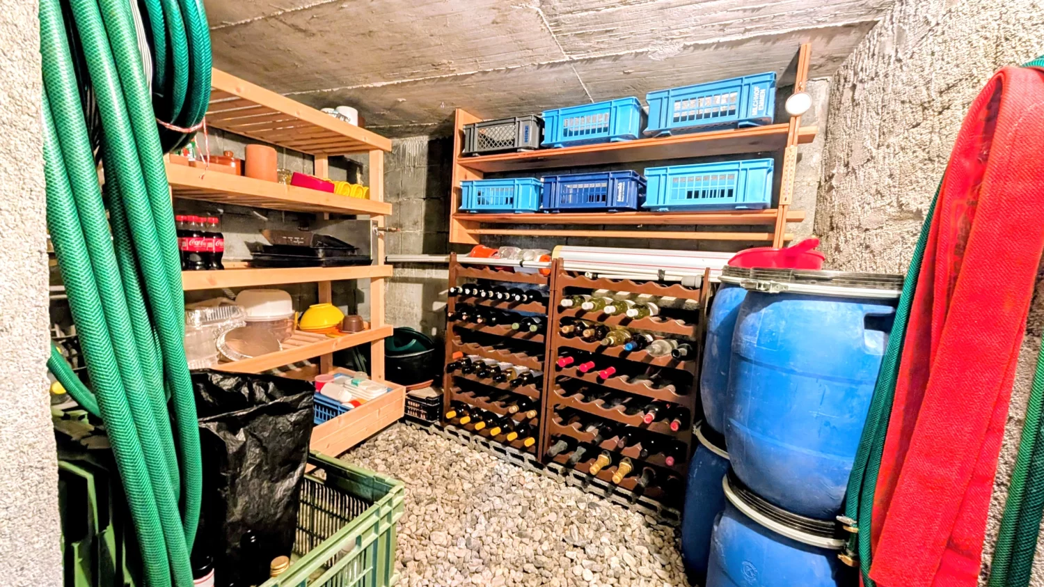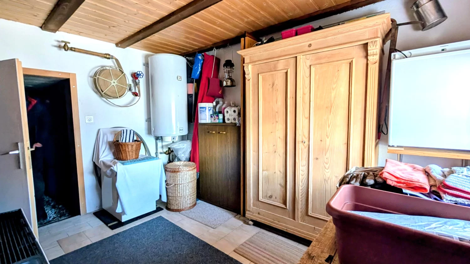 Im Erdgeschoss befinden sich ein kühler Naturkeller zur Vorratshaltung, eine praktische Waschküche mit Abstellfläche sowie ein Badezimmer mit Dusche und WC, beheizt durch einen kleinen Elektroofen. Eine Wendeltreppe führt in die Wohnküche, die mit einem Schwedenofen eine behagliche Atmosphäre schafft. Von hier aus erfolgt auch der Hauszugang. Direkt davor liegt der gemütliche Aussensitzplatz mit Steingrill – ein idealer Ort für gesellige Stunden im Freien.